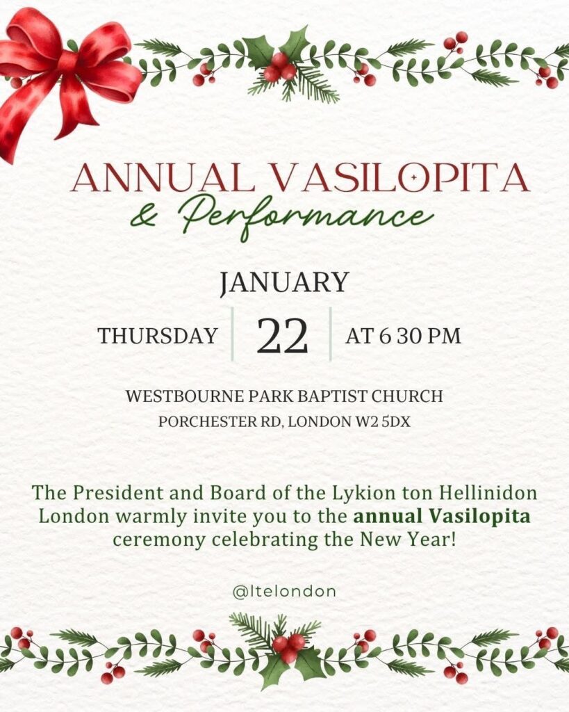 Vasilopita 2026 Date: 22 January 2026 Time: 18:30 Venue: Westbourne Park Baptist Church, Porchester Road, London W2 5DX Η Πρόεδρος και τα Μέλη του Διοικητικού Συμβουλίου του Λυκείου των Ελληνίδων Λονδίνου σας προσκαλούν στην ετήσια κοπή Βασιλόπιτας για τον εορτασμό της Νέας Χρονιάς! Στις 22 Ιανουαρίου 2026 στις 18:30 στο Westbourne Park Baptist Church, Porchester […]