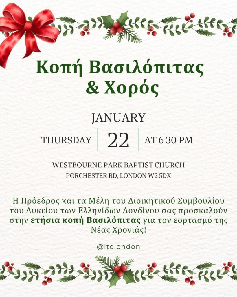 Η Πρόεδρος και τα Μέλη του Διοικητικού Συμβουλίου του Λυκείου των Ελληνίδων Λονδίνου σας προσκαλούν στην ετήσια κοπή Βασιλόπιτας για τον εορτασμό της Νέας Χρονιάς! Στις 22 Ιανουαρίου 2026 στις 18:30 στο Westbourne Park Baptist Church, Porchester Road, London W2 5DX!